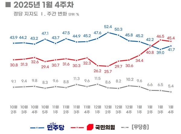 [폴리뉴스 김승훈 기자] 12·3 비상계엄 후 윤석열 대통령의 탄핵·체포·구속 국면에서도 이어지던 국민의힘 정당 지지율 상승세가 멈췄다. 지난 조사에서는 국민의힘 정당 지지율이 5주 연속 상승하면서 6개월 만에 오차범위 밖에서 더불어민주당을 앞선 것으로 나타났으나 이번 조사에서는 국민의힘이 소폭 하락하고, 민주당은 상승하면서 오차범위 내로 좁혀졌다.