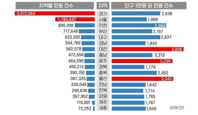 신청 지역이 확인된 민원 1201만 8962건을 지역별로 보면 경기(30.1%), 서울(14.4%), 인천(7.4%), 부산(6.0%), 대구(5.2%) 등의 순으로 많았다. 제주 지역 민원은 11만 9801건으로 17개 시도 중에서 세종 다음으로 적었다. 인구 1만 명당 민원 건수는 제주가 1787건으로 전북, 강원, 경북보다는 수치가 높았다.