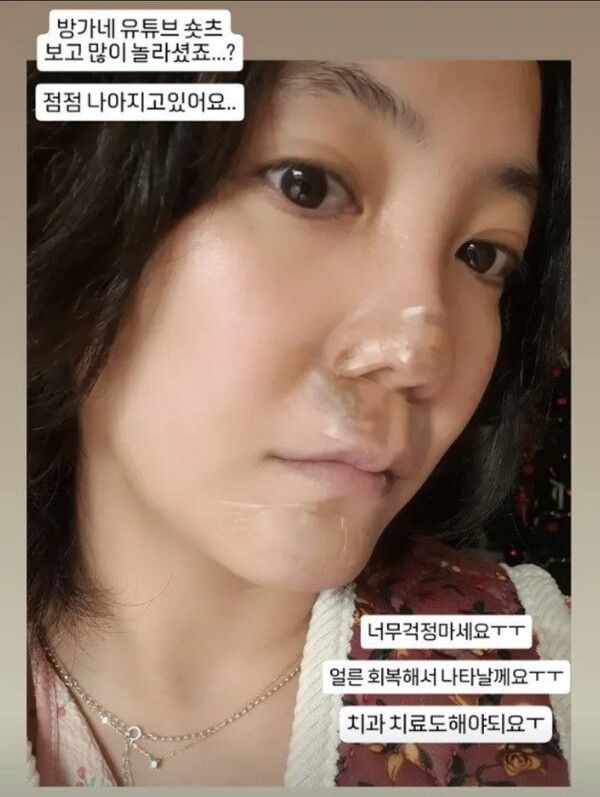 고은아는 26일 자신의 인스타그램 스토리를 통해 "처음 다친 날"이라는 글과 함께 얼굴에 붕대를 감은 사진을 공개했다. 그는 "방가네 유튜브 쇼츠 보고 많이 놀라셨죠, 점점 나아지고 있어요"라며 팬들의 걱정에 대한 답글을 남겼다.