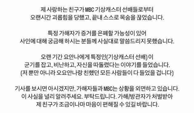 지난해 세상을 떠난 MBC 기상캐스터 오요안나 사망과 관련된 안타까운 사연이 다시 주목받고 있다. 직장 내 괴롭힘 정황이 담긴 유서와 카카오톡 대화 내용이 공개되면서, 지인들이 그를 추모하며 SNS에 남긴 글들이 화제가 되고 있다.