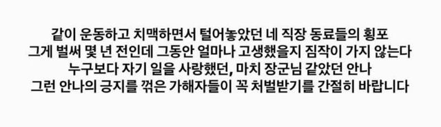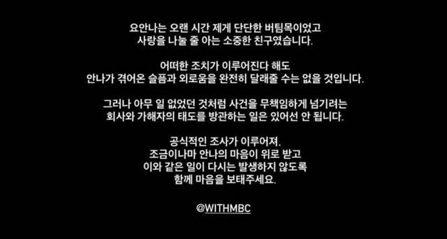 한 지인은 인스타그램에 “같이 운동하고 치맥 하며 네가 털어놨던 직장 동료들의 횡포를 기억한다. 그때부터 고통스러웠던 너를 생각하면 마음이 아프다”라고 전했다. 또 다른 지인은 “누구보다 자신의 일을 사랑했던 안나. 그런 긍지를 꺾은 가해자들이 처벌받기를 간절히 바란다”며 그의 고통과 가해자들의 행위를 고발했다. SNS에 올라온 지인 글에는 “오랜 시간 선배들의 군기 잡기와 따돌림, 비난을 견뎌야 했던 친구의 이야기를 세상에 알리고 싶다. 가해자들과 방관자들은 반드시 처벌받아야 한다”는 내용도 담겨 있어 공분을 사고 있다.