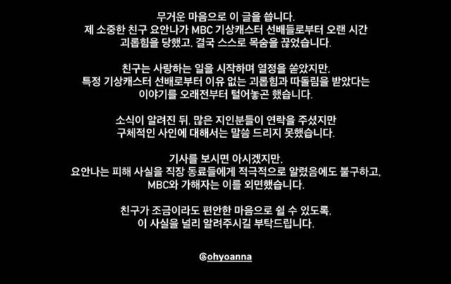 한 동료는 tvN 예능 ‘유퀴즈 온 더 블럭’ 출연 섭외를 받은 오요안나에게 “네가 무슨 말을 할 수 있느냐”며 모욕적인 발언을 한 정황까지 드러난 것으로 파악됐다. 오요안나는 유서를 통해 “내가 사랑하는 일을 마음껏 사랑하지 못하는 것이 싫다”며 자신을 사랑해 주는 사람들이 불편해지는 것을 원하지 않았다는 심경을 전한 것으로 알려졌다.