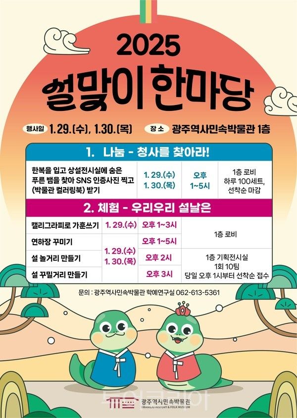 임찬혁 광주역사민속박물관장은 “시민들에게 푸른 뱀이 상징하는 새로운 도전과 성장 에너지를 선사할 수 있도록 다양한 나눔‧체험 프로그램을 준비했다”며 “설 연휴 박물관 나들이를 통해 희망을 채워가는 시간이 되기를 바란다”고 말했다.