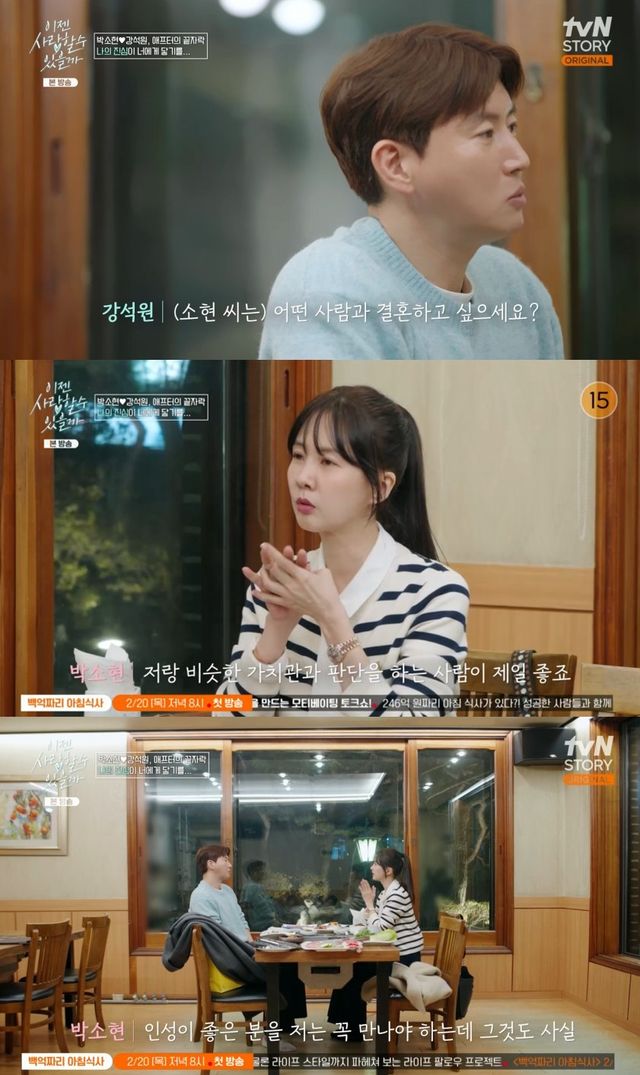 강석원은 박소현에 "어떤 사람과 결혼하고 싶냐"고 물었고, 박소현은 "저랑 비슷한 가치관과 판단을 하는 사람이 제일 좋다"며 "건강하고 같은 사고를 하는 사람을 만나는 게 꿈"이라고 말했다.