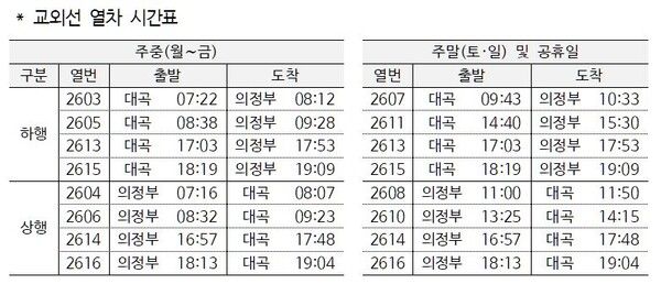 지난 11일 운행재개한 교외선은 대곡역에서 의정부역까지 무궁화호 열차가 하루 8회 운행하며, 초기 안정화 단계를 거치고 있다.