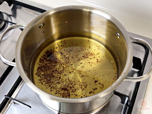 기름이 식으면 체에 걸러서 불순물을 제거하고