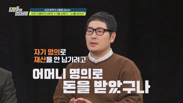 27일 방송된 ‘탐정들의 영업비밀’에서는 ‘도깨비 탐정단’을 찾아온 의뢰인이 친하게 지내던 동생이자 인플루언서에게 약 5억원 정도의 사기를 당했다고 호소했다.