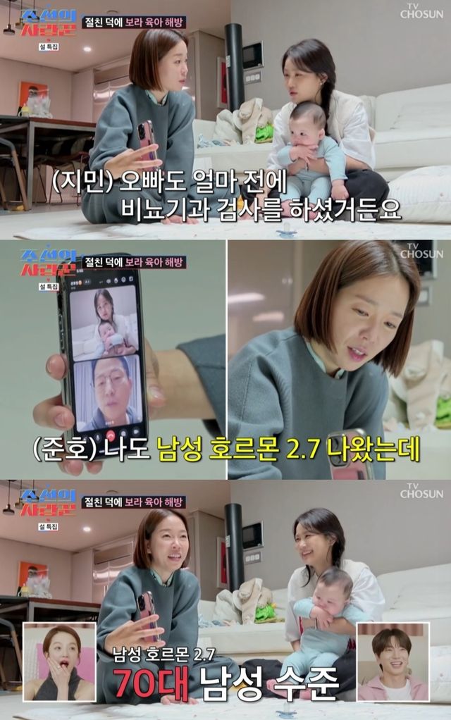 그런 가운데 김지민은 "오빠도 얼마전에 비뇨기과 검사를 했다"며 "(남성 호르몬 수치가) 최악으로 나왔다"고 고백했다. 그와중에 김지민의 난소 나이는 27세로 좋은 결과가 나왔다고. 그에 반해 김준호의 남성 호르몬 수치는 70대 수준이라고.