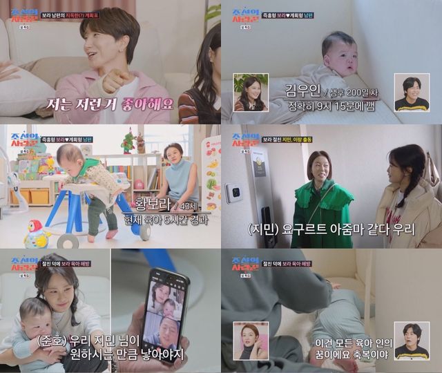 이후 황보라는 "(육아에선) 남편이 선장이고 저는 조타수다"라며 남편의 기적의 수면법(?)을 공개했다. 생후 200일인 우인이는 일정대로 정확히 9시 15분에 기상하고 낮잠 시간에 맞춰 잠드는 놀라운 모습을 보여줬다. 기상과 수유, 낮잠, 이유식 시간까지 빼곡하게 적혀 있는 일정과 남편이 미리 준비해 놓은 이유식에 이특은 "너무 좋다...내 스타일이다"라며 첫눈에 반해 웃음을 선사했다. 하지만 '슈퍼맘' 황보라에게도 육아 피로가 몰려오기 시작했다. 그때 황보라의 든든한 지원군인 '육아 베테랑' 정이랑과 '예비신부' 김지민이 찾아와 황보라에게 자유시간을 선사했다.