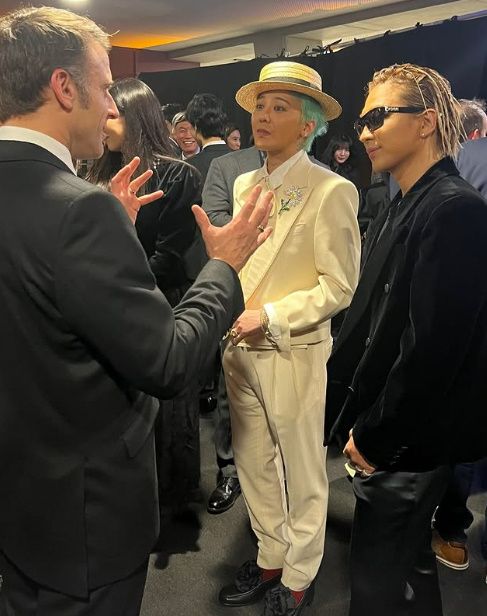 지난 27일 태양은 자신의 소셜 미디어 계정에 별다른 문구 없이 마크롱 대통령과 대화 나누는 사진을 공개했다. 그의 옆에는 지드래곤도 함께했다.
