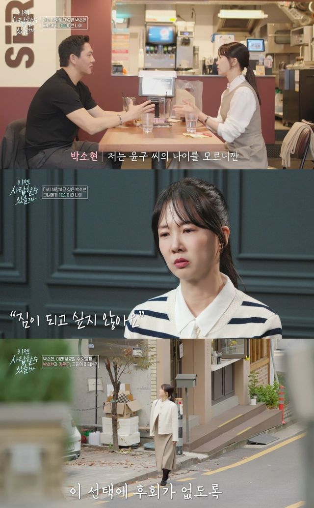 이어 "나도 한걸음 더 나아가서 폭넓은 사랑을 하고 싶은 마음이 간절했다. 그럼에도 불구하고 열 살은 나에게 너무 힘들었다. 윤구 씨에게도 상처가 되기 때문에. 윤구 씨에게 짐이 되고 싶지 않았다"고 고백했다.