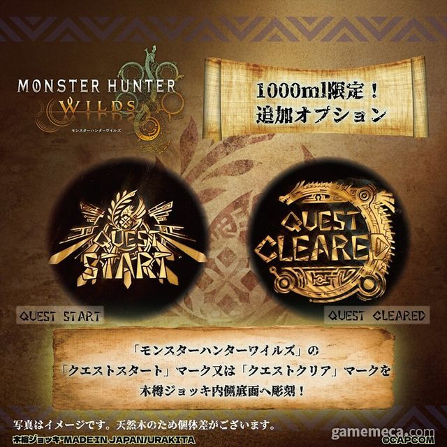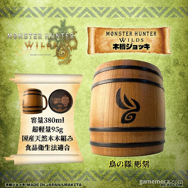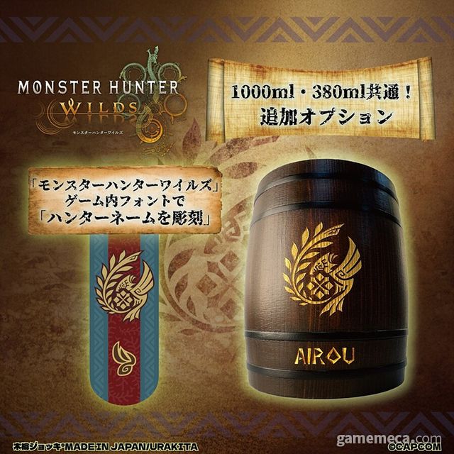 일본 머그컵 제조 회사 우라키타(Urakita)는 28일, 몬스터 헌터 와일즈 테마 맥주잔을 출시했다. 용량은 1000ml와 380ml 두 가지로, 가격은 각각 1만 7,380엔(한화 약 16만 원), 1만 1,880엔(한화 약 11만 원)이다.