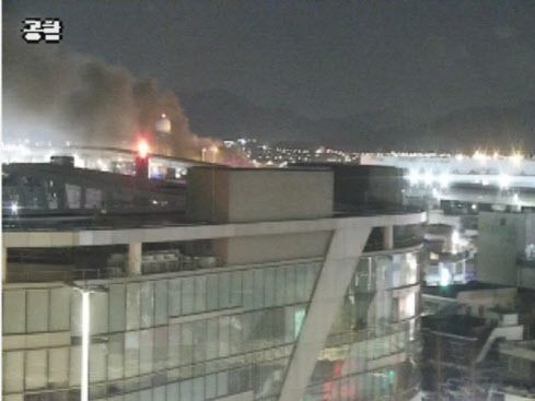 28일 오후 10시 30분께 김해공항에서 홍콩행 에어부산 항공기 꼬리 부분에서 불이 났다.