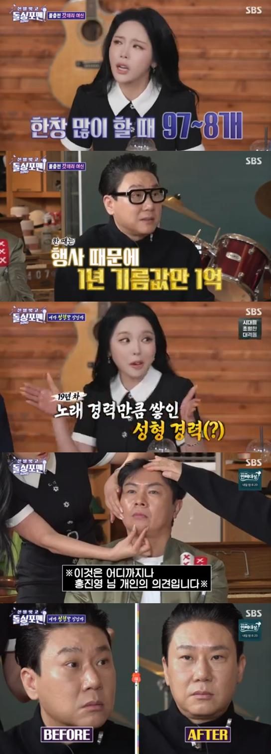 또 이날 홍진영은 한창 행사를 많이 했을 때 한 달에 98개까지 해봤다고 말하면서 기름값만 1년에 1억을 썼다고 말해 놀라움을 자아냈다. 또 홍진영은 노래만큼이나 주변 사람들의 성형 견적을 잘 내준다고.