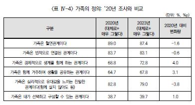 한편 가족의 정의에 관한 동의 정도는 △가족은 혈연관계(87.4%) △가족은 법적으로 연결된 관계(83.1%) △가족은 심리적으로 유대감을 느끼는 친밀한 관계(79.0%) △가족은 경제적으로 생계를 함께 하는 관계(72.8%), △가족은 함께 거주하며 생활을 공유하는 관계(67.8%) △가족은 내가 선택하고 구성할 수 있는 관계(39.7%) 순이었다.