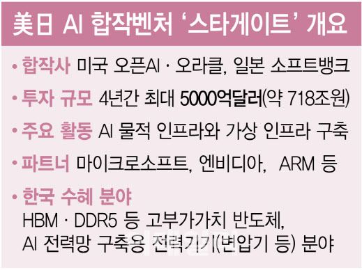 트럼프 대통령은 오픈AI, 오라클, 소프트뱅크 3개 기업이 ‘스타게이트’라는 합작회사를 설립해 AI 인프라에 투자한다는 계획을 제시했다. 초기 투자액은 1000억달러(약 143조원)이고, 4년간 최대 5000억달러(약 718조원)까지 투자 규모를 확대한다는 방침이다.