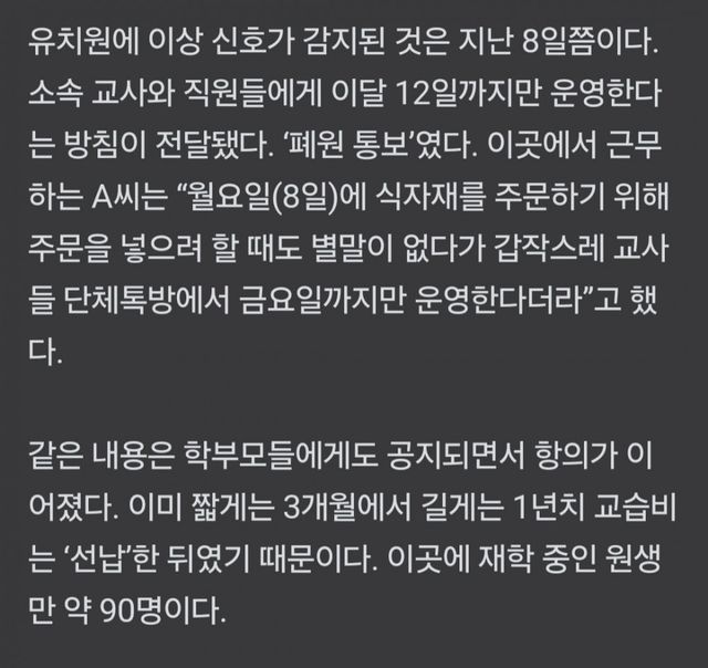덕분에 하루아침에 학부모들은 이미 납부한 교육비 다 잃게 생기고