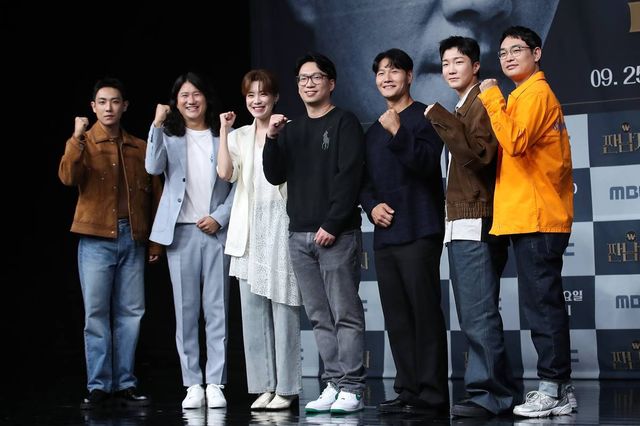이준(왼쪽부터)과 임우일, 장도연, 노승욱 PD, 김종국, 이승훈, 박영진이 2024 9월 25일 서울 마포구 상암 MBC에서 열린 새 예능 ‘짠남자’ 제작발표회에 참석해 포즈를 취하고 있다. ‘짠남자’는 김종국과 절약 DNA를 가진 '소금이'들이 ‘흥청이&망청이’들의 생활 습관을 뜯어보며 참교육하는 프로그램이다 / 뉴스1