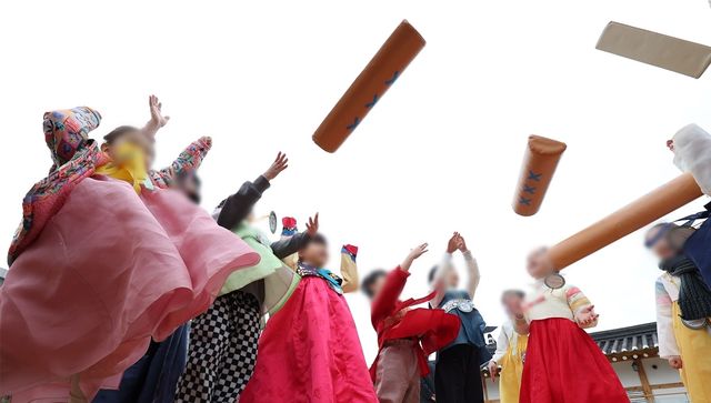 명절을 맞아 한복을 차려 입은 어린이들이 윷놀이를 하고 있다. 기사 이해를 돕기 위한 자료 사진. 주요 교외 아울렛이 올해 설날 당일 정상 영업한다. / 연합뉴스