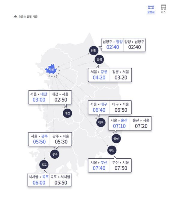 한국도로공사에 따르면 이날 오전 11시 기준 서울요금소를 출발해 승용차로 전국 주요 도시 요금소까지 가는 데 걸리는 예상 시간은 부산 7시간 40분, 울산 7시간 10분, 대구 6시간 40분, 목포 6시간, 광주 5시간 50분, 강릉 4시간 20분, 대전 3시간 등이다.