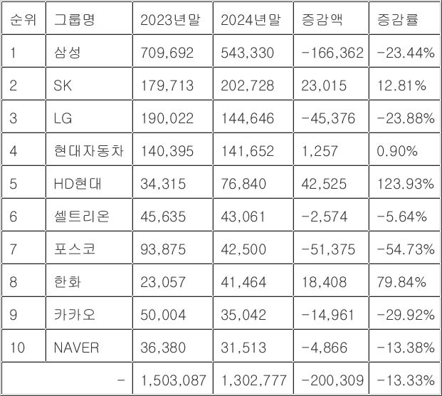 LG그룹은 3위로 한 계단 내려앉았으며, 현대차그룹은 4위를 유지했다. 반면, HD현대그룹과 한화그룹은 조선 및 방산업의 호조 속에 각각 5위와 8위로 급부상했다.