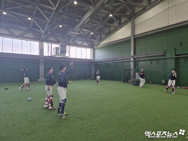 포수조는 타격 훈련이 끝나기 무섭게 장비를 착용했다. 정상호 배터리코치와 실내 훈련장에서 캐치볼 후 수비 훈련에 임했다. 아침 기온은 다소 쌀쌀한 편이었지만 선수들의 몸은 금세 땀으로 젖었다.