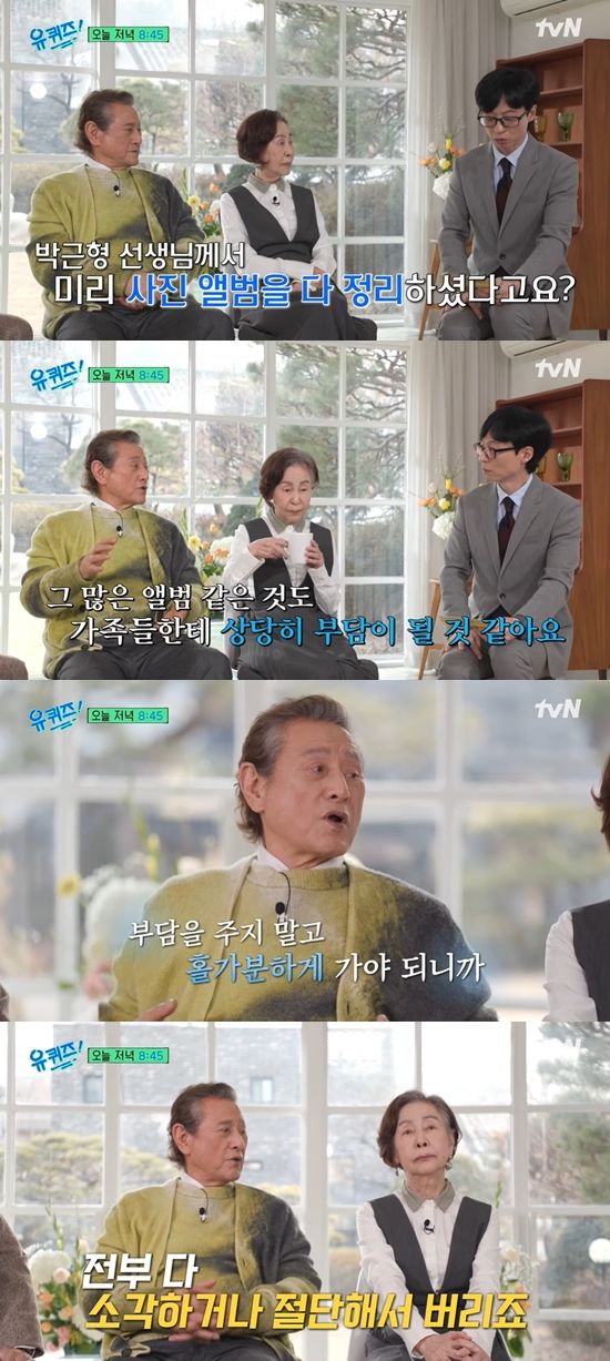 공개된 영상에서 박근형은 '미리 사진 앨범을 다 정리했다고 들었다'는 질문에 "연극 공연했던 거, 영화 했던 거 사진들이 가족들에게 남겨주기엔 상당한 부담이 될 거 같더라. 유지할 수가 없지 않나. 일곱, 여덟 권 되는 걸 평생 가지고 있겠나"라고 말했다.