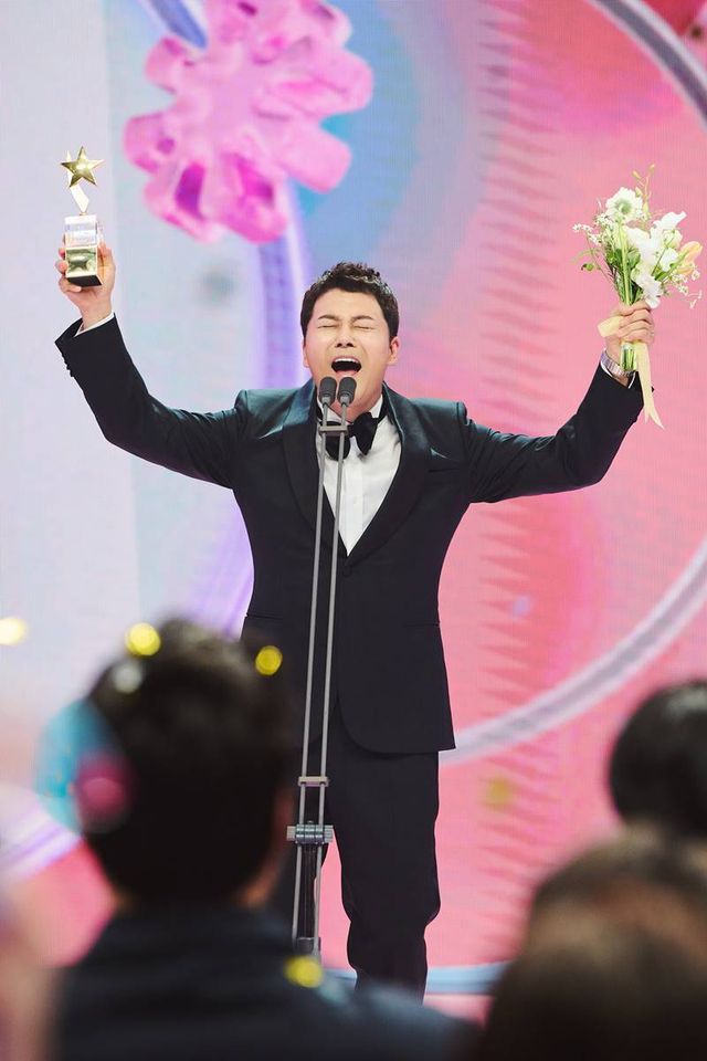 방송인 전현무가 지난 28일 서울 상암동 MBC에서 진행된 '2024 MBC 방송연예대상'에서 '대상'을 받은 뒤 기뻐하고 있다 / 뉴스1(MBC 제공)