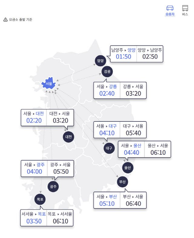한국도로공사에 따르면 이날 오후 6시 서울 요금소를 출발해 승용차로 전국 주요 도시 요금소까지 가는 데 걸리는 예상 시간은 부산 5시간 10분으로 나타났다. 서울서 울산까지는 4시간 40분, 대구 4시간 10분, 목포 3시간 50분, 광주 4시간, 강릉 2시간 40분, 대전 2시간 20분 등이다. 오전보다는 다소 정체가 풀리는 모습이다.