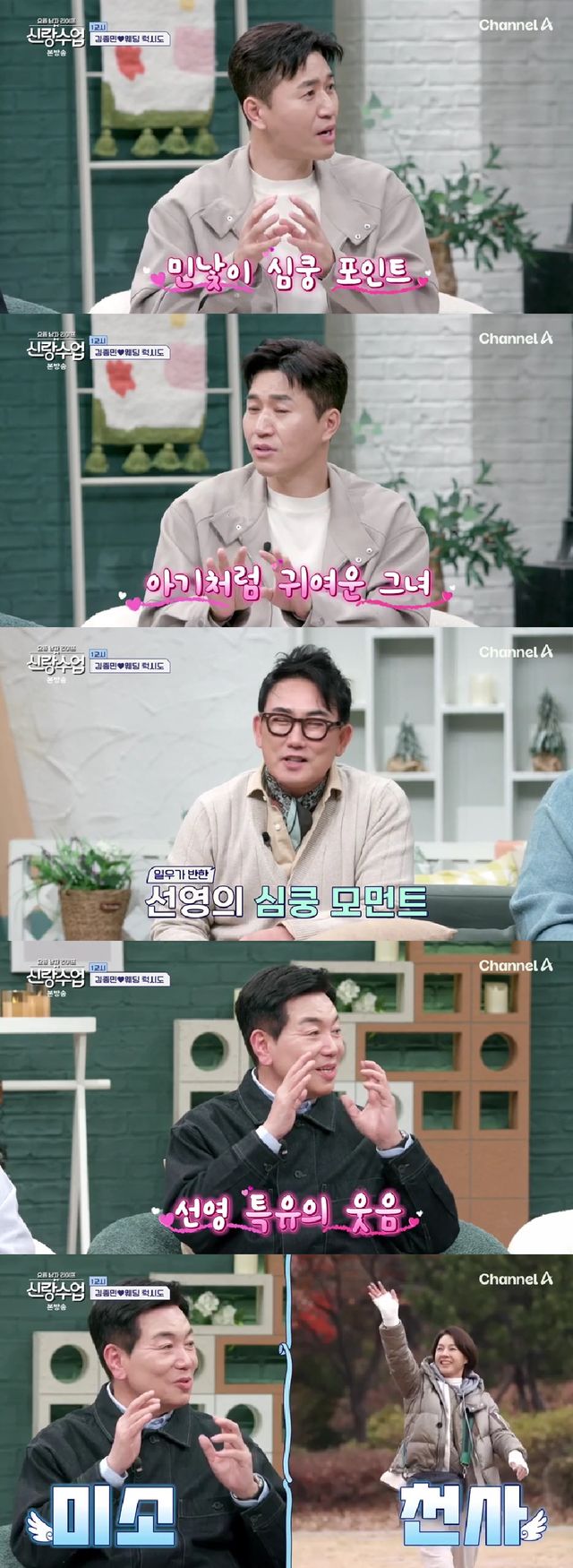 예비 신랑들이 볼때 에비 신부가 가장 예뻐 보일때가 언제냐는 질문에 김종민은 "저는 솔직히 화장 안 할 때가 너무 예쁘다. 얼굴이 애기 같아서 귀엽다. 화장할 때는 어른 같다"고 애정을 드러냈다.