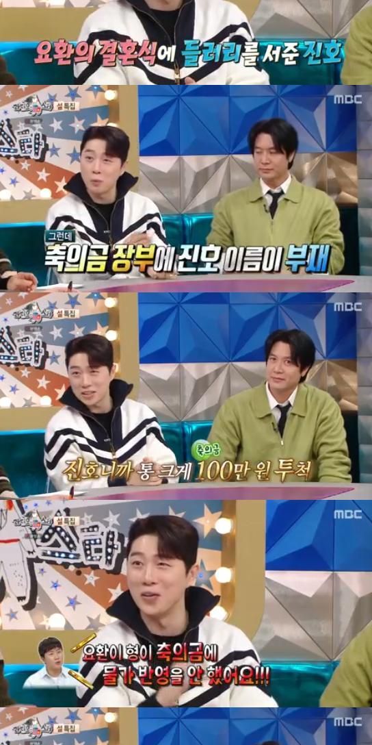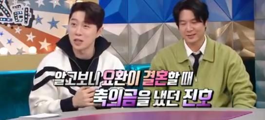 이어 "진호가 얼마 전에 결혼을 하지 않았냐. 축의금을 얼마를 할까 고민을 하다가 100만원을 했다. 그런데 진호가 방송에서 저한테 '축의금에 물가 반영을 안했다'고 하더라. 알고보니 제 결혼 때 진호가 100만원을 냈던거다"고 말해 웃음을 줬다.
