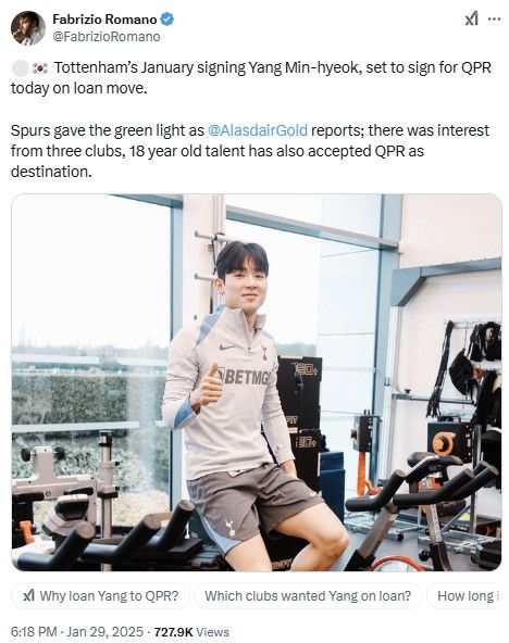 유럽 축구 이적시장 전문가 파브리치오 로마노도 양민혁의 QPR 임대를 알렸다. 그는 29일 자신의 SNS를 통해 "토트넘은 이번 1월 겨울 이적시장을 통해 양민혁을 영입했다. 그는 오늘 QPR 이적을 앞두고 있다"라고 밝혔다.