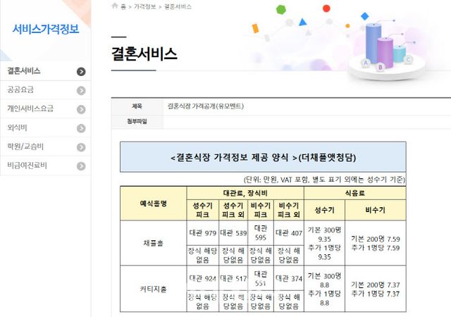 30일 공정거래위원회에 따르면 한국소비자원이 운영하는 ‘참가격’ 등에는 지난 24일부터 11개 결혼식장·결혼준비대행업체별 결혼서비스 가격이 공개됐다.