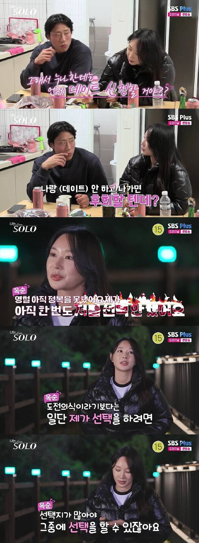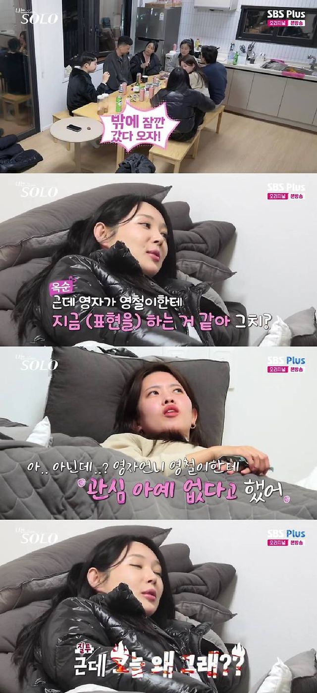 하지만 옥순은 “근데 오늘 왜 그래?”라며 예민해했다. 공용 거실로 돌아온 옥순은 “그래서 누나한테 언제 데이트 신청할 거야?”라고 영철에게 훅 ‘플러팅’을 날렸다.