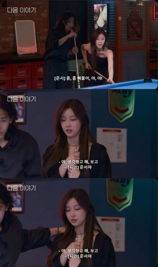넷플릭스 '솔로지옥' 시즌4 예고편에서 당구 게임에서 실수한 이시안 어깨 누르는 육준서 / 넷플릭스 '솔로지옥' 시즌4