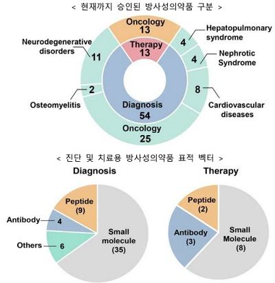 질병 진단에 사용되는 54개 승인된 방사성 의약품은 종양 영상용 25개(46.3%), 중추신경계 영상용 11개(20.4%), 심혈관 영상용 8개(14.8%)이다.
