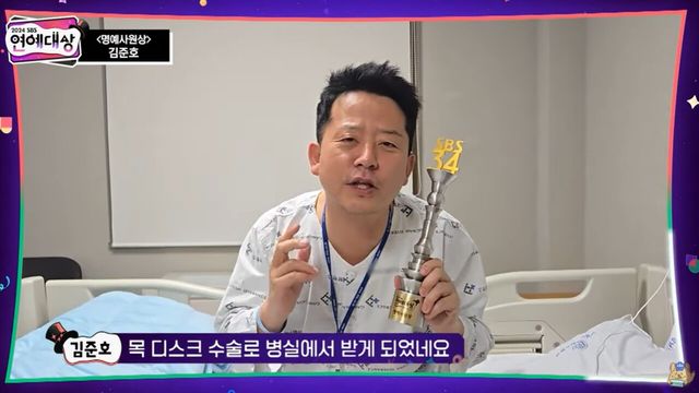 김준호는 병실 침대에서 트로피를 받고는 "여러분 반갑습니다. 제가 직접 SBS 연예대상에 가서 상을 받아야 하는데 무척 아쉽다"라고 수상 소감을 전했다.
