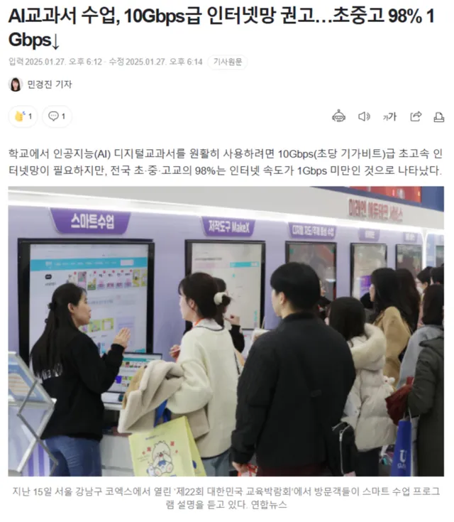 AI교과서 수업, 10Gbps급 인터넷망 권고.. 초중고 98% 1Gbps↓