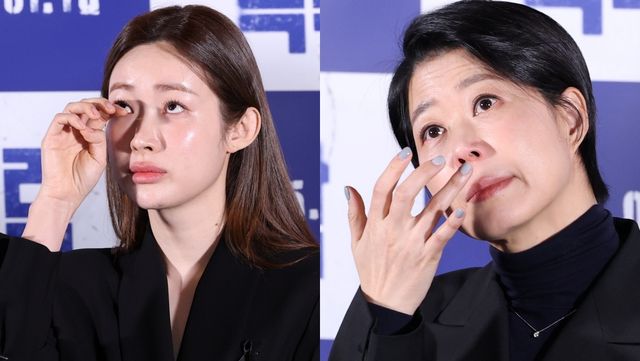 영화 '폭락' 기자간담회에서 송재림을 떠올리며 눈물을 보인 차정원과 소희정 / 뉴스1