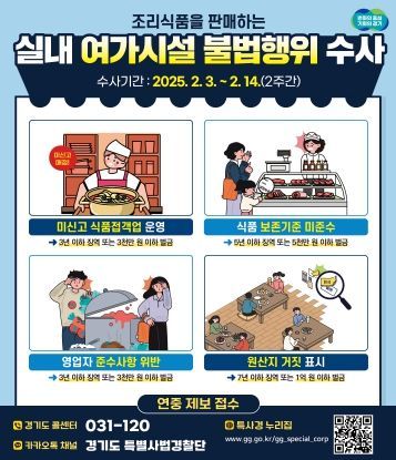 [와이뉴스] 경기도는 특별사법경찰단에서 겨울추위와 미세먼지를 피해 실내여가시설을 이용하는 방문객의 증가에 따라 2월 3일부터 14일까지 조리식품을 판매하는 PC방, 스크린골프장, 키즈카페 등을 대상으로 불법행위를 집중 수사한다고 밝혔다.