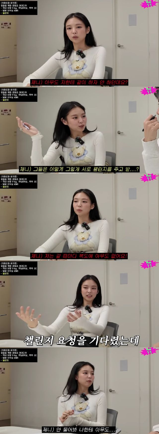 챌린지에 대해 제니는 "제가 아직 제대로 해본 적이 없다"며 "아무도 저한테 같이 하자고 안 하던데요?"라고 서운함을 드러냈다.