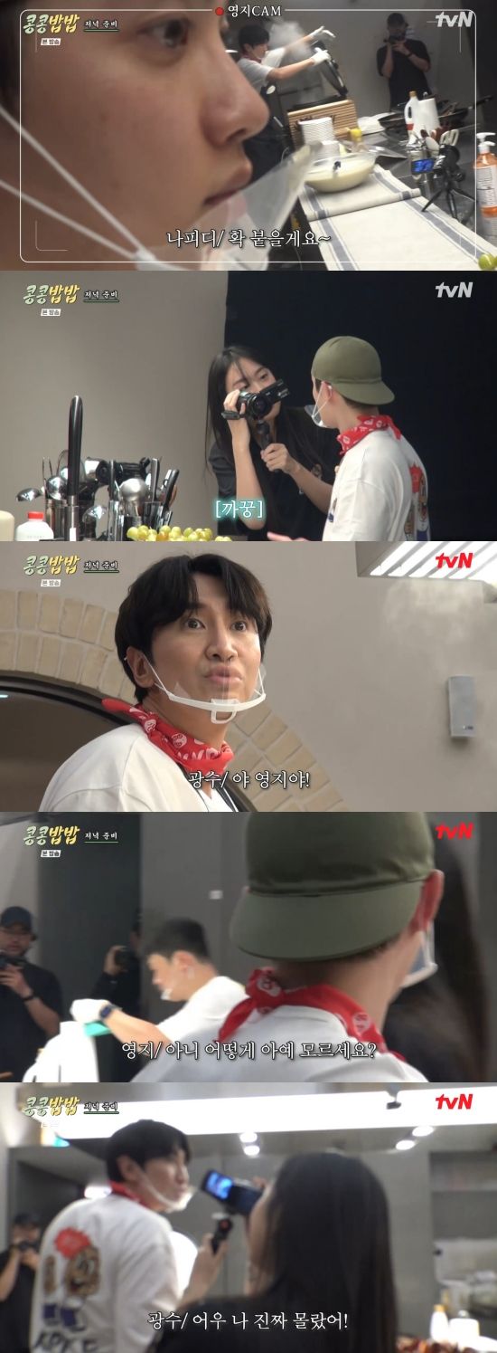 이광수는 "깜짝이야. 언제? 언제부터 있었어?"라며 물었고, 이영지는 "저 한 10분 전부터 계속 찍고 있었다. 밥 먹으러 왔다"라며 털어놨다.