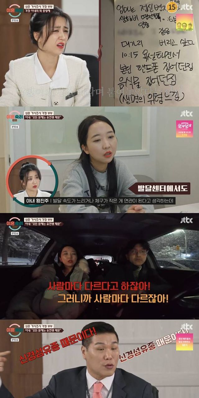 걱정 아내는 불만 사항을 글로 적어 벽에 붙여놓았다. 남편은 신경섬유종을 앓고 있었고, 이에 대해 남편은 "건강에 대해 많이 염려를 하는 것 같다. 건강 염려증이라고 생각을 한다. 병원을 못해도 7~8곳은 다닌다. 연애할 때도 그랬다. 토요일 아침에 정형외과, 내과, 치과, 정신과 네 군데 돌고. 병원 도는 게 루틴이었다. 의사들이 이상 없다고 대답한다"라고 말했다.
