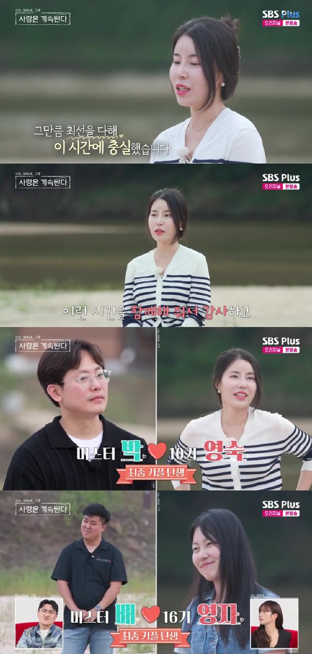 (엑스포츠뉴스 이유림 기자) 10기 영숙♥미스터 박, 16기 영자♥미스터 배, 10기 영자♥미스터 흑김이 최종 커플이 됐다.