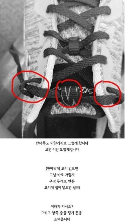 러너스 노트라고 오래전 아식스에서 개발한 기술이며, 지금은 특허 만료되서 대부분 운동화 만드는 회사에서 쓰이고 있음. 저 형태로 신발을 묶으면 뒷꿈치 들리는 일 없이