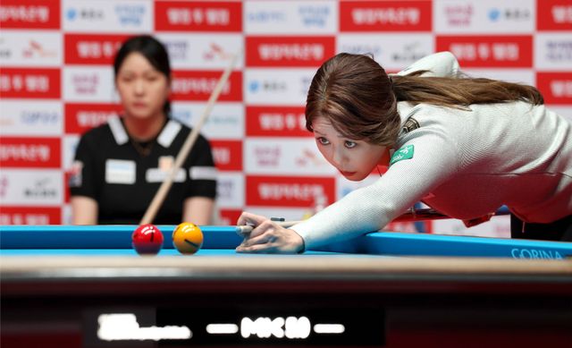 실제 김민아와 결승 무대는 만만치 않았다. 첫 세트 1이닝부터 4점 하이런을 주고받으며 팽팽히 맞선 뒤 김민아가 먼저 1세트를 따내며 기선 제압에 성공했다. 김가영은 4이닝부터 공타에 시달렸다. 경기가 잘 풀리지 않으면서 자연스레 천적 관계가 떠오를 수밖에 없었다.