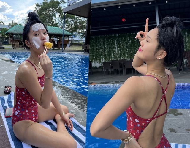 사진 속 미미는 레드톤의 원피스 수영복을 입고 수영장에서 여유로운 시간을 보내고 있다. 미미는 얼굴에 팩을 붙인 자연스러운 모습으로 물각에서 신난 분위기가 여과없이 드러나 보는 이들까지 미소를 더한다.