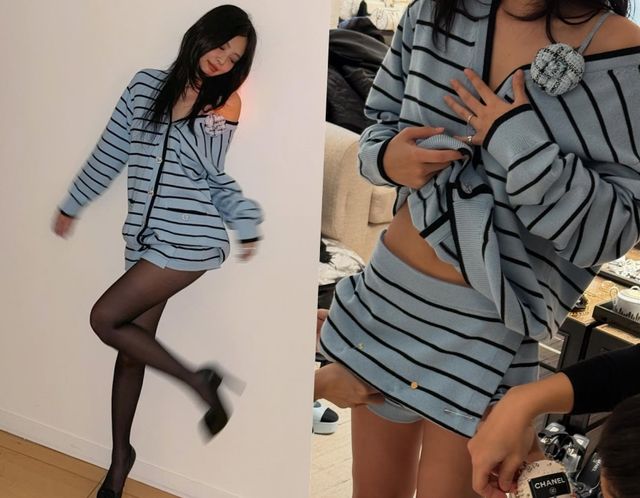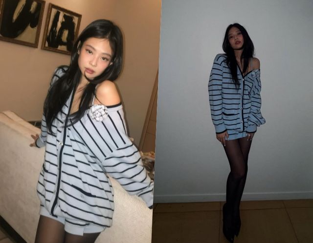공개된 사진 속 제니는 블루톤의 루즈핏 가디건을 입고 한쪽 어깨를 드러냈다. 하의는 가디건과 같은 질감의 초미니로 매칭해 하의실종 무드로 섹시미를 더했다. 제니의 아름다운 자태에 시선이 쏠리는 것.