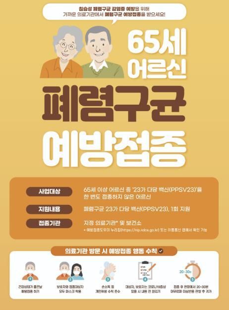 접종 대상자가 신분증을 가지고 지정 병원(348곳)을 가면 23개 종류의 혈청형이 있는 ‘폐렴구균 23가 다당질 백신’을 접종해 준다.