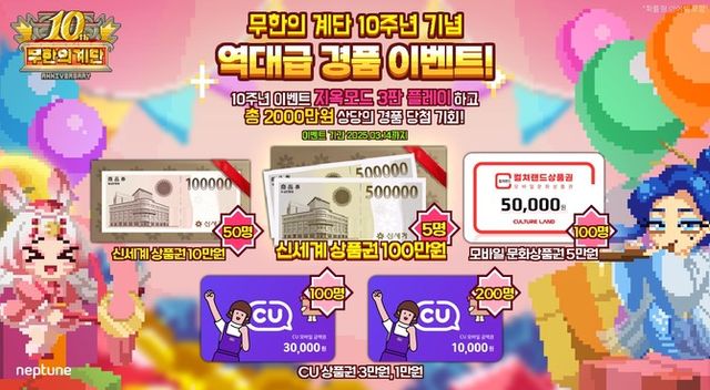 [프라임경제] 넵튠(217270)은 자사의 대표 모바일 게임 '무한의 계단' 출시 10주년을 기념해 2000만원 규모의 경품 이벤트를 진행한다고 31일 밝혔다.